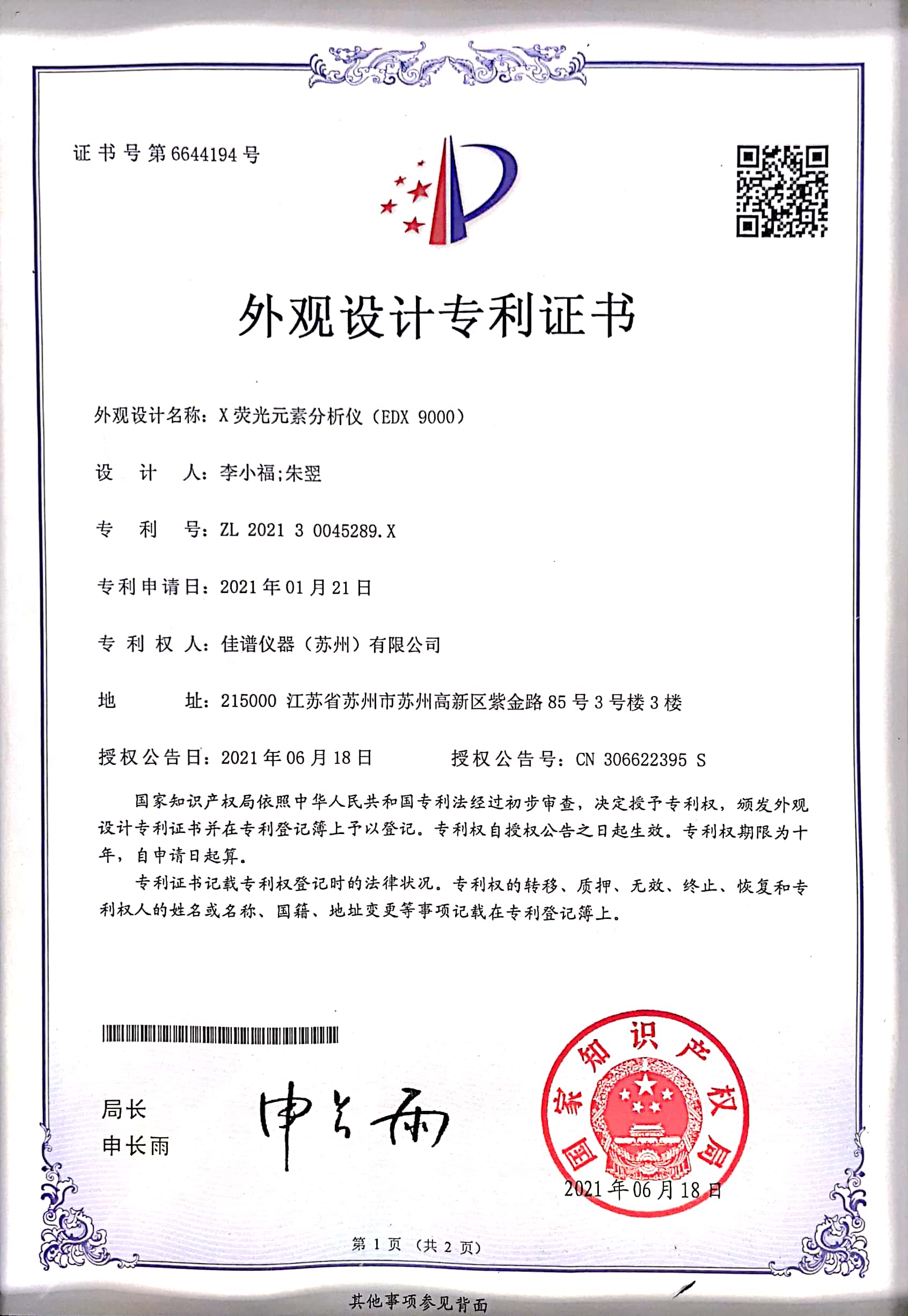 外觀設計專利證書-X熒光元素分析儀(EDX 9000).jpg