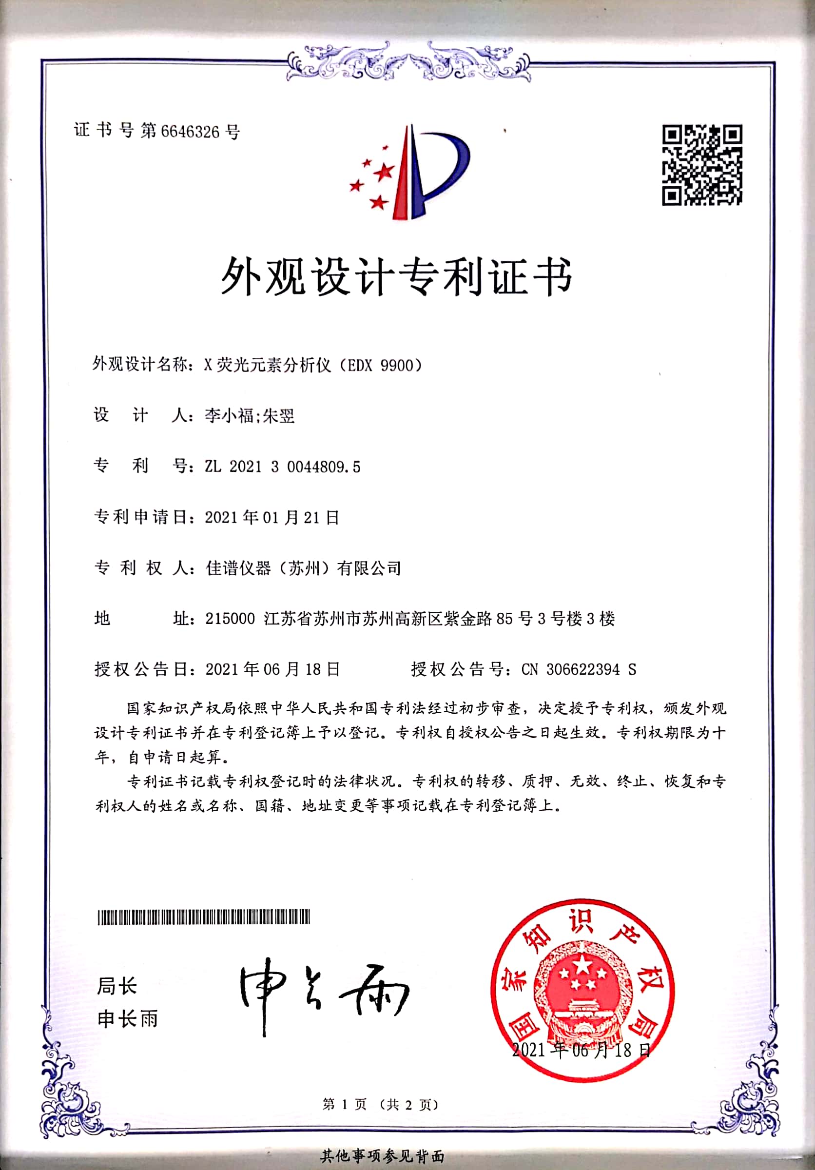 外觀設計專利證書-X熒光元素分析儀(EDX 9900).jpg